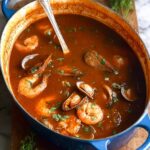 If you want to freeze this stew, it’s best to do so before adding the seafood. Freeze the tomato-wine broth base in portions, then thaw and add fresh seafood when ready to eat. This prevents texture changes that can occur with freezing cooked shellfish and fish.