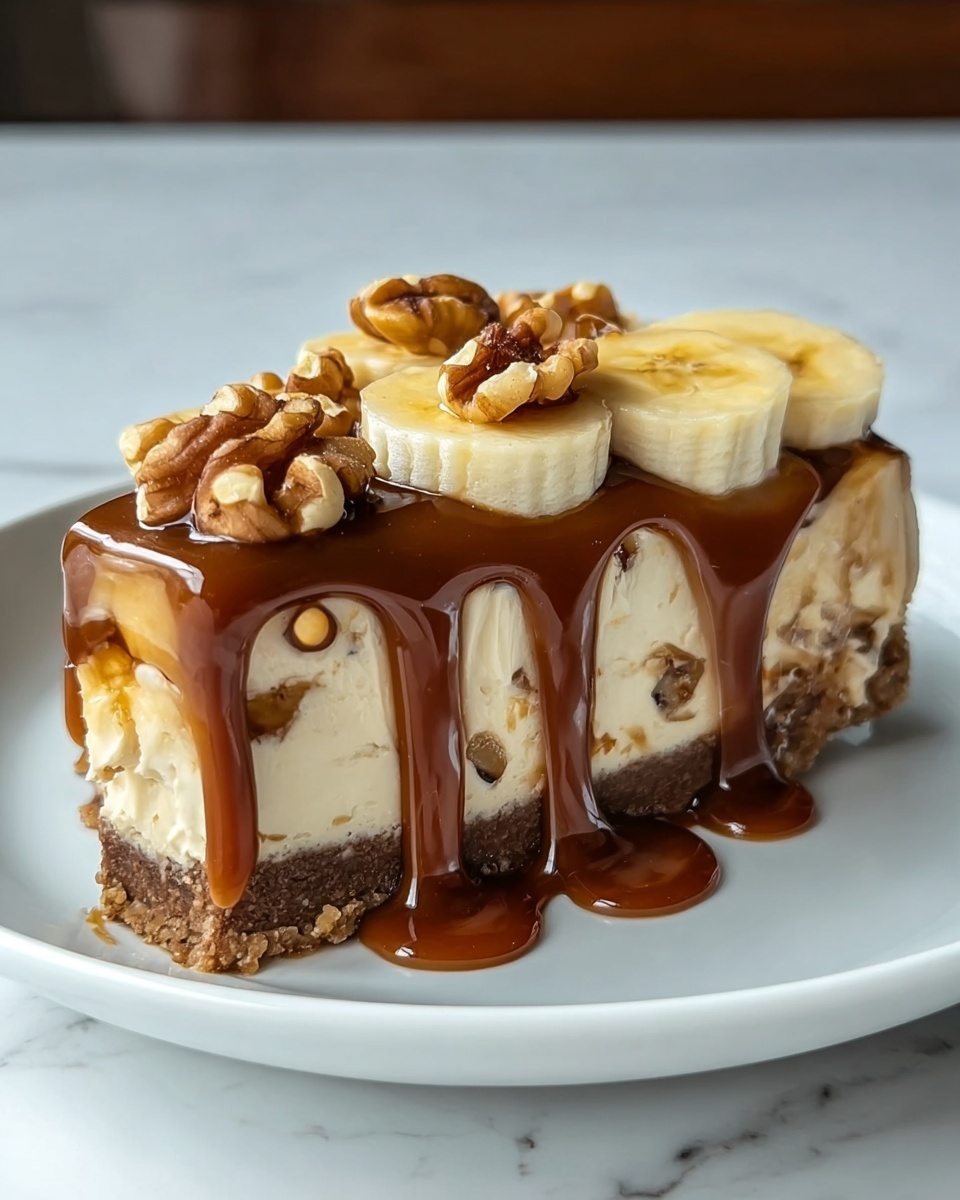 For a fun twist, serve individual mini cheesecakes in mason jars or small ramekins layered with crushed nuts and caramel at the bottom. Alternatively, create a dessert platter with cheesecake slices, fresh fruits, and small bowls of toppings like chopped nuts, caramel, and whipped cream, so everyone can customize their slice. Presentation really brings this Banana Caramel Nut Cheesecake Recipe to life and makes sharing even more enjoyable.