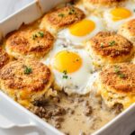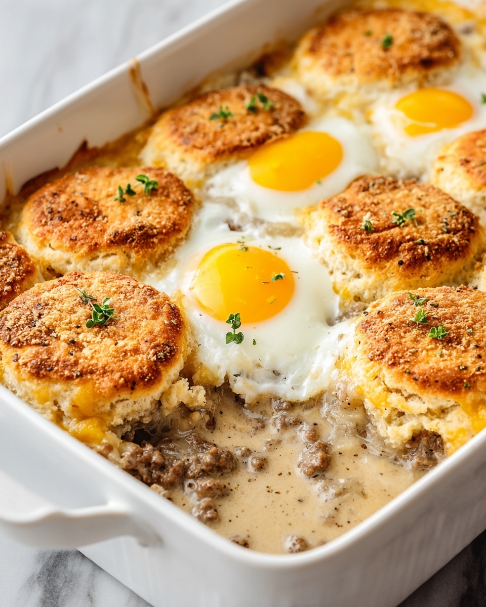 A comforting and hearty breakfast casserole featuring flaky biscuits layered with savory sausage gravy, eggs, and optional cheddar cheese, baked to golden perfection for a satisfying morning meal.