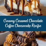 This decadent Caramel Chocolate Coffee Cheesecake features a rich and creamy blend of cream cheese with swirls of caramel, chocolate, and coffee flavors on a buttery graham cracker crust. It is baked to perfection, then chilled to achieve the ideal creamy texture. Topped with whipped cream, caramel pieces, and extra caramel sauce, it’s an indulgent dessert perfect for coffee and chocolate lovers alike.