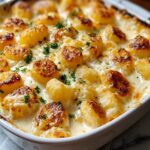 This Chicken Alfredo Tater Tot Casserole is a comforting and hearty baked dish combining tender shredded chicken in a creamy Alfredo sauce with peas, topped with crispy golden tater tots and melted mozzarella cheese. Perfect for a family dinner, it’s easy to prepare and bakes to bubbly, cheesy perfection.