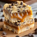 These decadent Chocolate Chip Caramel Bars combine rich caramel and classic chocolate chips layered between buttery cookie dough. Perfectly baked to golden perfection, they offer a delightful balance of gooey caramel and chewy chocolate chip cookie texture in every bite, making them an irresistible treat for dessert lovers.