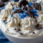 Cookie Monster Fluff is a fun and vibrant dessert featuring a light, creamy blue fluff combined with crunchy chocolate chip cookies. This no-bake treat is perfect for parties and gatherings, offering a delightful mix of sweet vanilla pudding, whipped topping, tangy sour cream, and cookie crunch, all chilled to perfection.