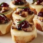 Delightful Cranberry Brie Bites featuring flaky puff pastry filled with melted creamy Brie cheese and tangy cranberry sauce, accented with optional nuts, fresh rosemary, and a drizzle of honey for a perfect festive appetizer or snack.