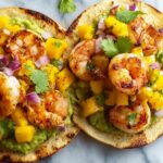 - Assembly: Spread a layer of mashed avocado evenly onto each crispy tostada. Top with a portion of roasted shrimp, then spoon a generous amount of mango coconut salsa over the shrimp.