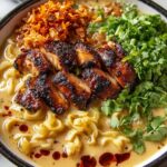 This Fiery Chicken Ramen with Creamy Garlic Sauce is a flavorful and spicy twist on classic ramen. Tender chicken breasts are seasoned with a bold blend of spices and cooked to perfection, then paired with ramen noodles in a rich, creamy garlic sauce that balances heat and savory notes. Garnished with fresh green onions, sesame seeds, and optional chili slices, this dish offers a comforting yet vibrant meal perfect for noodle lovers seeking a spicy kick.
