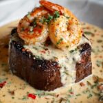 This elegant Filet Mignon with Shrimp and Lobster Cream Sauce recipe combines tender, perfectly seared filet mignon steaks with succulent shrimp and rich lobster meat in a creamy, flavorful sauce. Finished with Parmesan cheese and Dijon mustard, this dish delivers a luxurious seafood and steak pairing that’s perfect for a gourmet dinner or special occasion.