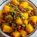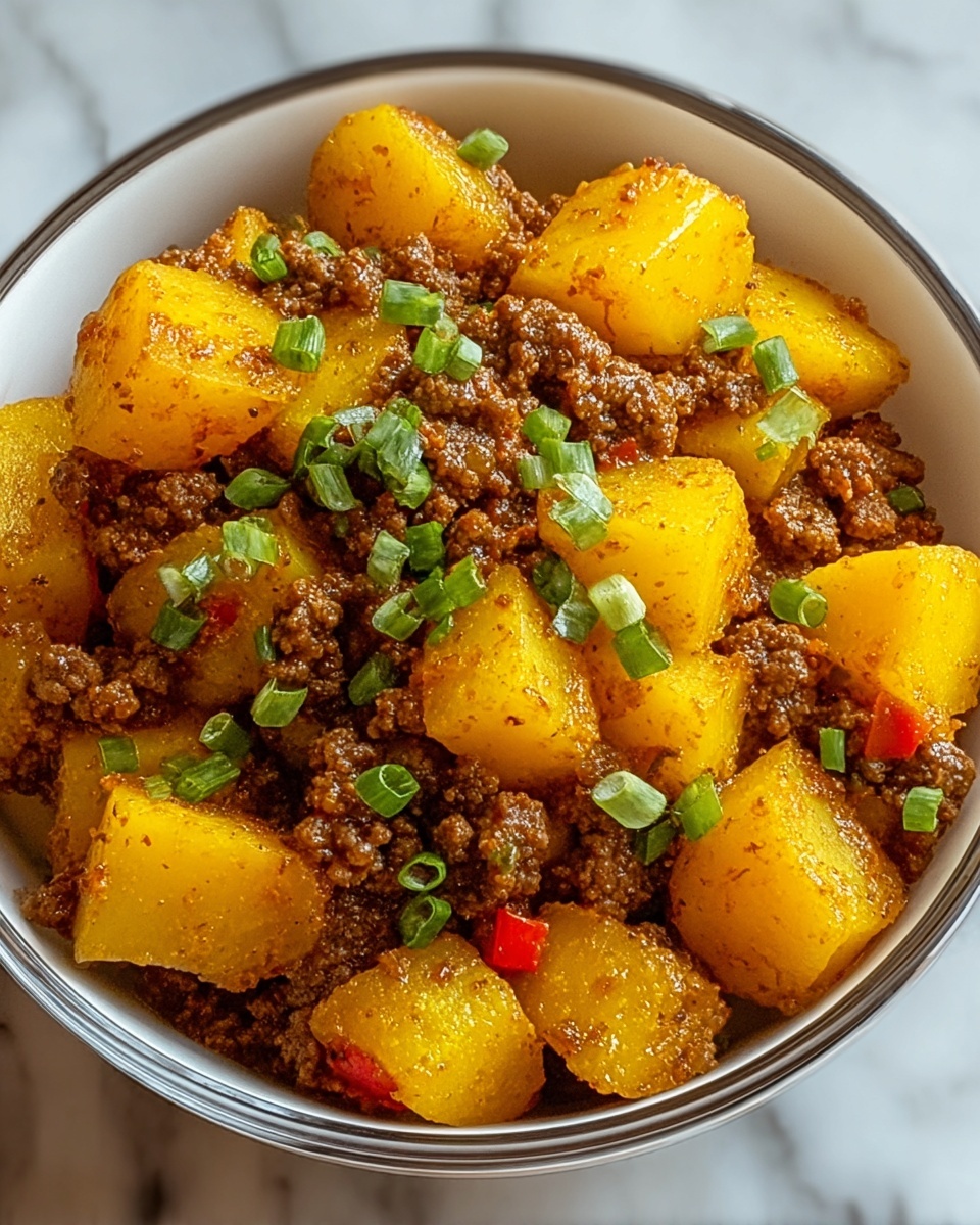 A comforting Ground Beef and Potatoes Casserole packed with tender potatoes, flavorful ground beef, and aromatic spices, cooked together on the stovetop for a hearty and satisfying meal perfect for weeknight dinners.