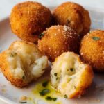 Mashed Potato Arancini are crispy, golden-fried balls made from creamy mashed potatoes blended with cheeses and seasonings. These Italian-inspired appetizers are perfect for using leftover mashed potatoes and offer a deliciously cheesy and savory bite, served hot with marinara dipping sauce.