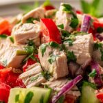 A quick and refreshing Mediterranean Tuna Salad featuring tuna, cherry tomatoes, cucumber, Kalamata olives, and feta cheese tossed in a zesty lemon-oregano dressing. Perfect for a light lunch or dinner, this salad combines vibrant flavors and wholesome ingredients for a healthy and satisfying meal.
