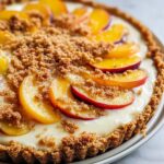 - Layer the Cheesecake and Peaches: Spread half of the cheesecake batter evenly over the prepared crust. Arrange the seasoned peach slices on top of this layer. Carefully spoon and spread the remaining cheesecake filling over the peach slices to cover them completely.