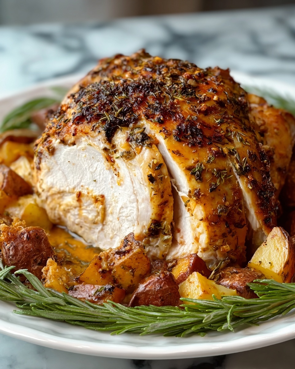This flavorful turkey breast pairs wonderfully with a range of classic sides. Creamy mashed potatoes, roasted root vegetables, or a crisp green salad bring balance and variety. For a Thanksgiving or holiday feast, consider traditional stuffing or cranberry sauce to complement the savory herbs.
