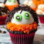 - Add Frankenstein Hair and Details: Press chocolate jimmies into the green frosting to simulate Frankenstein’s hair. Add candy eyeballs, use red string licorice for a smile, and place chocolate chews on the sides as bolts to complete the look.